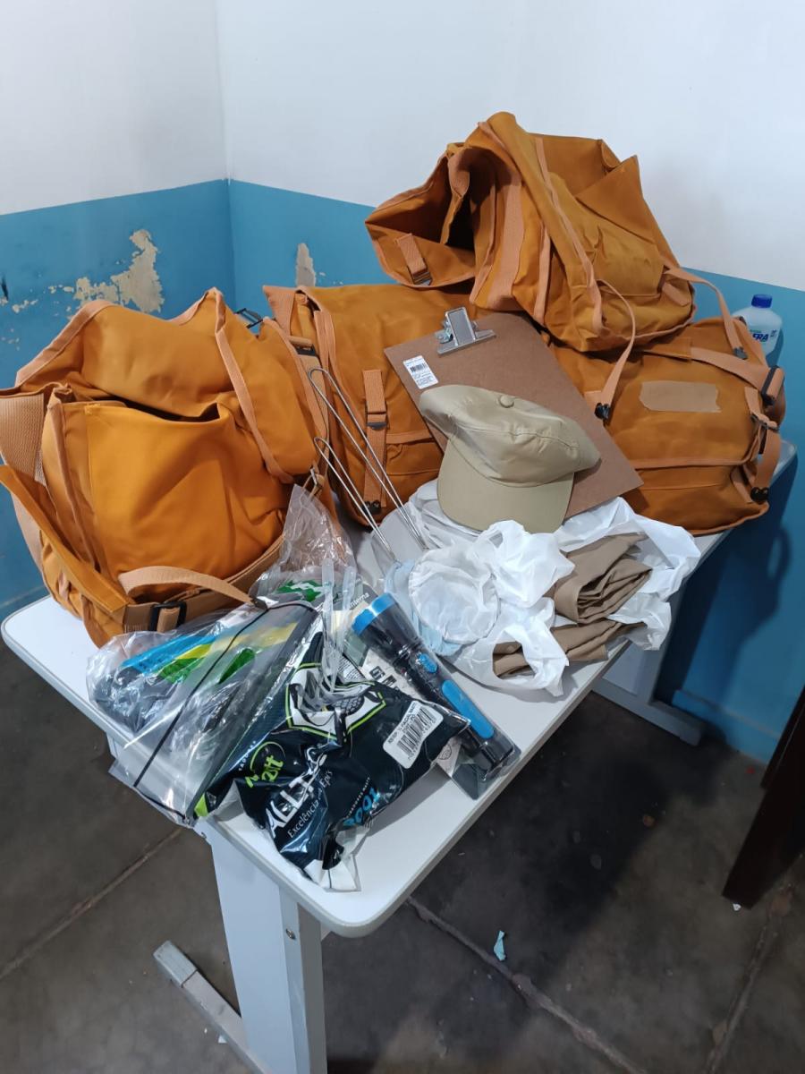 Os kits distribuídos incluem itens como camisas de proteção UV, calças, chapéus com abas largas, botas, máscaras, luvas e frascos de álcool em gel, entre outros materiais necessários para as atividades de campo.